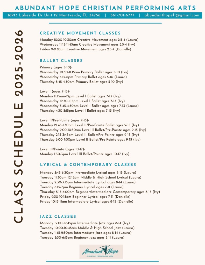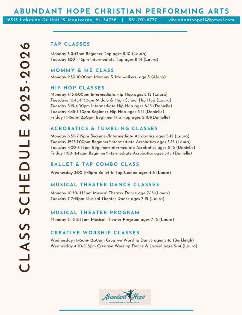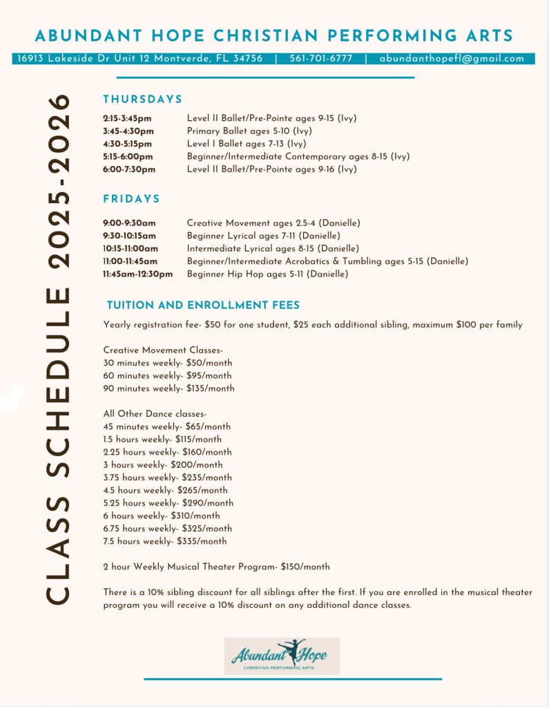 Here is our Fall 2025-Spring 2026 weekly class schedule: We start back on August 18!